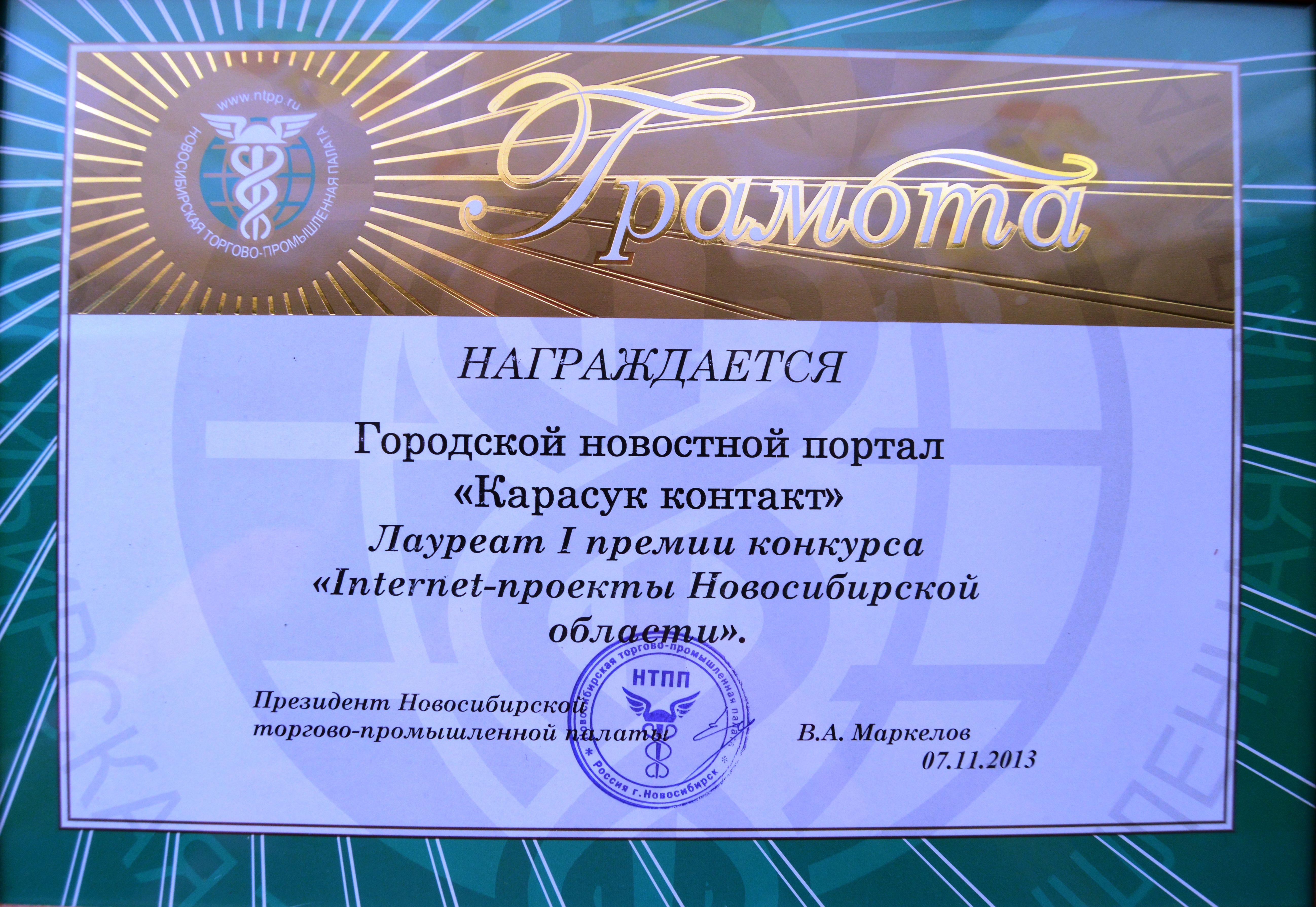 Седьмого ноября прошло награждение лауреатов конкурса "Интернет-проекты Новосибирской области — 2013". По итогам конкурса в номинации: «Средства массовой информации в Интернете, освещающие деловую жизнь региона» все три призовых места были распределены среди проектов г.Карасук в следующем порядке: